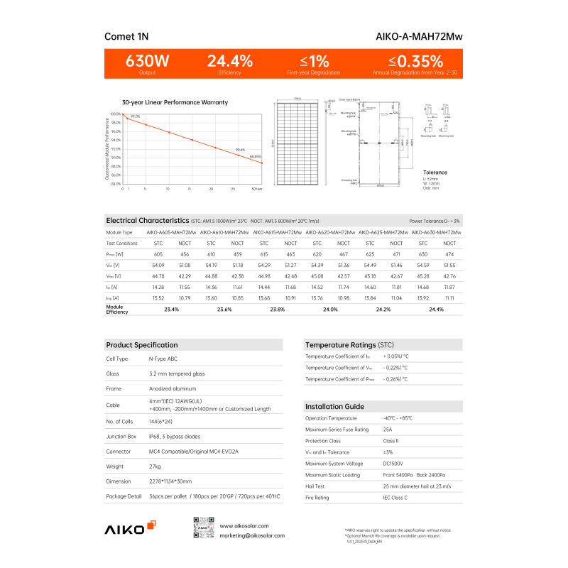 AIKO-A610-MAH72Mw - это высокоэффективный фотомодуль нового поколения созданный на базе инновационной технологии N-Type ABC (All Back Contact) мощностью 610 Вт с рекордной эффективностью 23.6%.