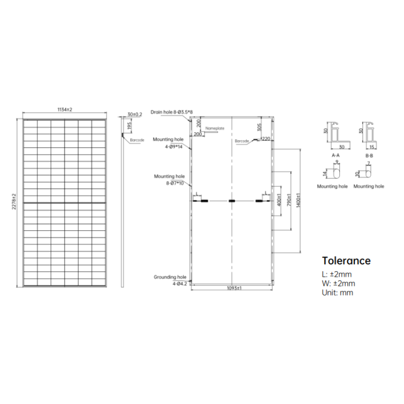 | Характеристика | Отклонение от заявленной мощности 0+3% ВтНоминальное напряжение (Vmp ) 44,8 ВНоминальная сила тока ( Imp) 13,6A Напряжение холостого хода ( Voc ) 54.19 ВТок короткого замыкания (Isc) 14,36 А КПД 23,6%Габариты: 2278*1134*30 ммВес 27 кг |