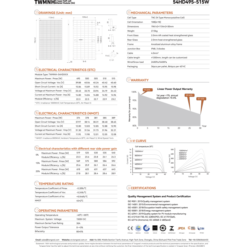 Солнечная панель TWMNH-54HD505 505Wp N-Type Bifacial (Black Frame) имеет вольт-амперные характеристики: