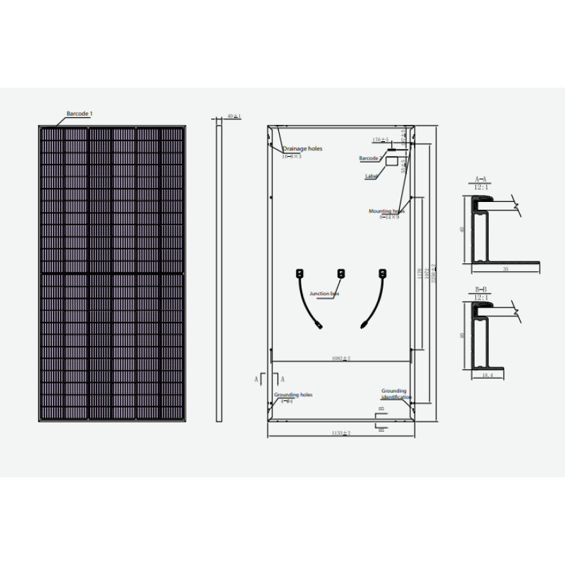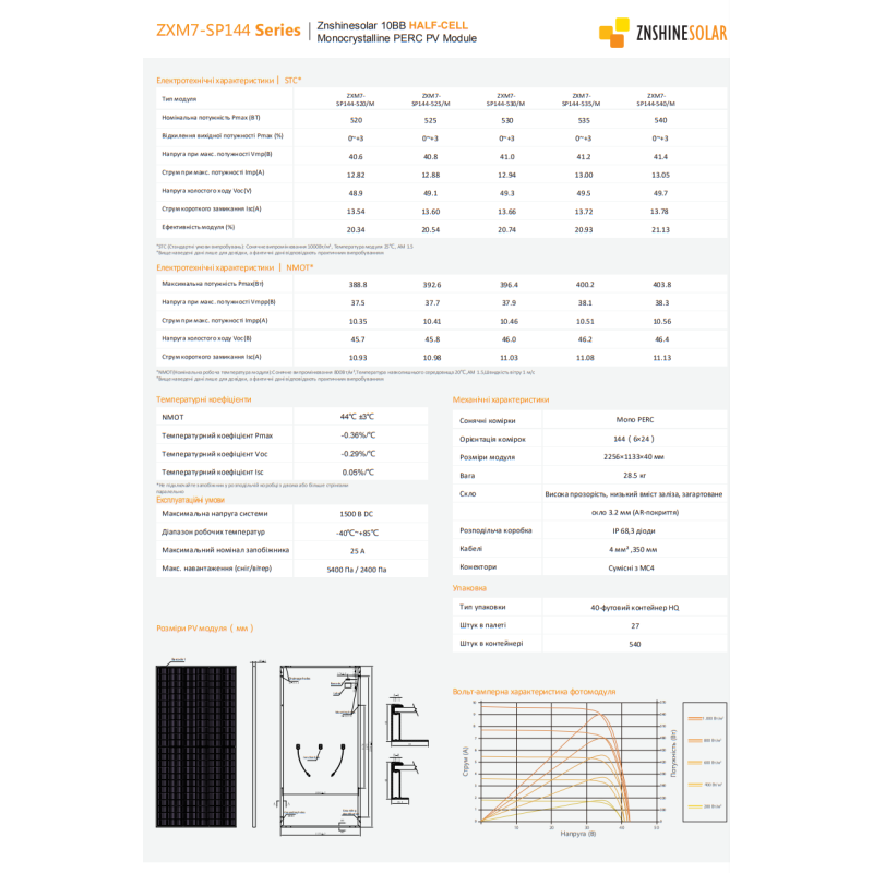 Характеристика | Отклонение от заявленной мощности 0~+3%, Максимальное напряжение 41 В, Максимальная сила тока 12,94 А, КПД 20,74 % , Габариты: 2256×1133×40 мм, Вес 28,5кг |