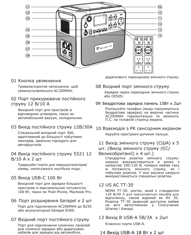 Комплект постачання : Облаштування AC200MAX, інструкція, зарядний пристрій від мережі змінного струму (500 Вт), кабель перехідник під фотомодуль, автомобільний зарядний кабель (+ конектор) тип XT90, мануал.