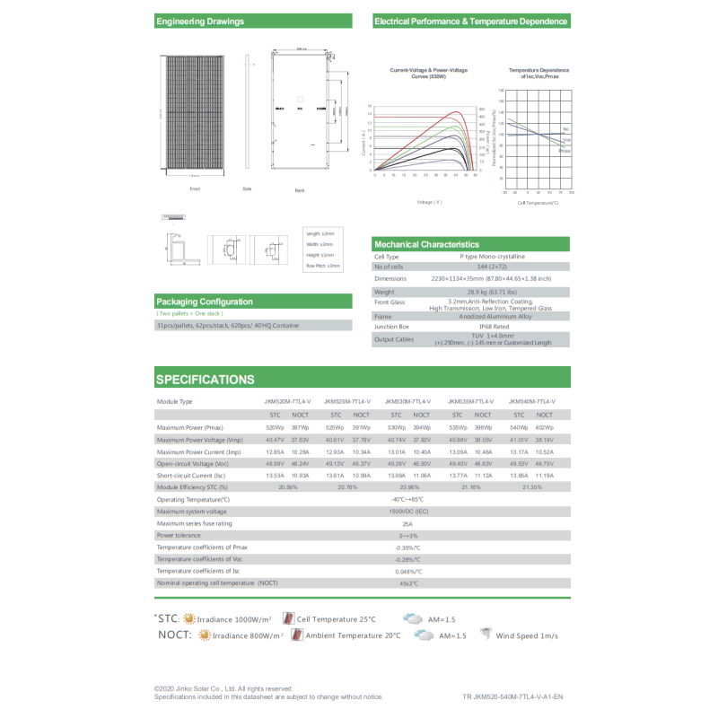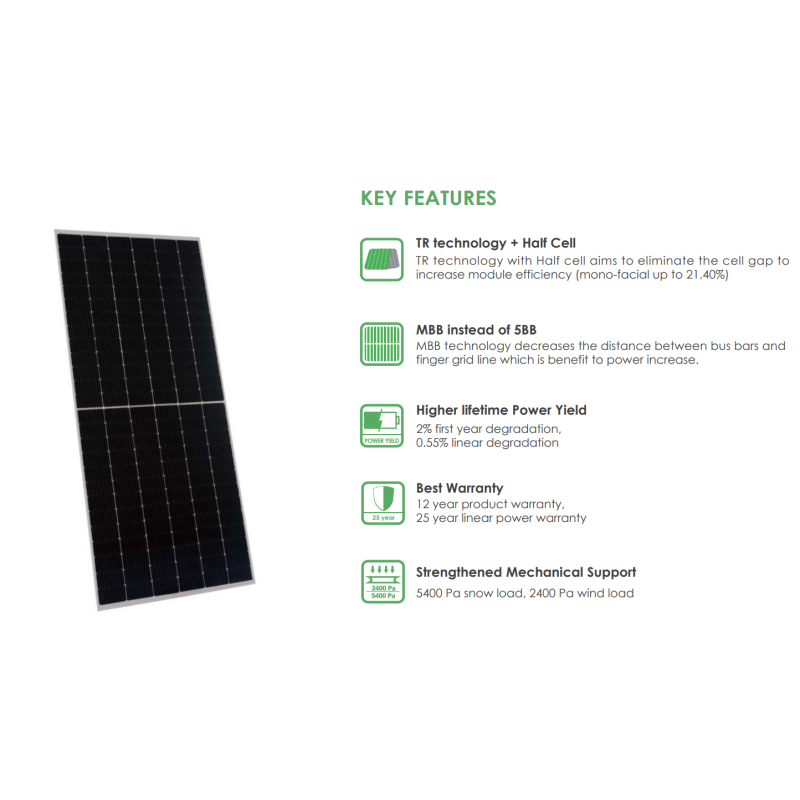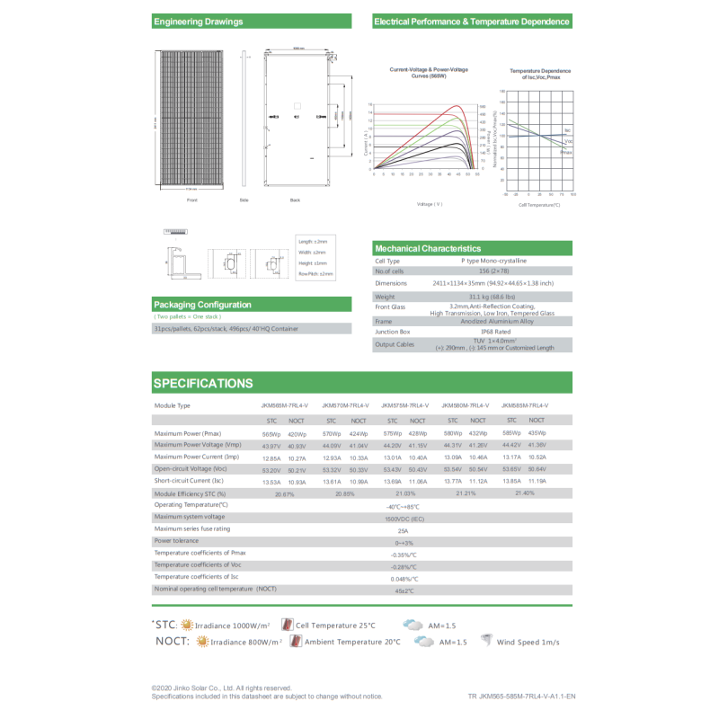 Характеристика | Потужність сонячних панелей від 520 до 585 ВтВідхилення від заявленої потужності 0~+3% Максимальна напруга від 40,61 до 44,42 В Максимальна сила струму від 12,85 до 13,17 А ККД до 21,40% Габарити: 520- 540 Вт 2230×1134×35 мм, Вес 28,9 кг Габарити: 565- 585 Вт 2411×1134×35мм, Вага 31,1 кг |