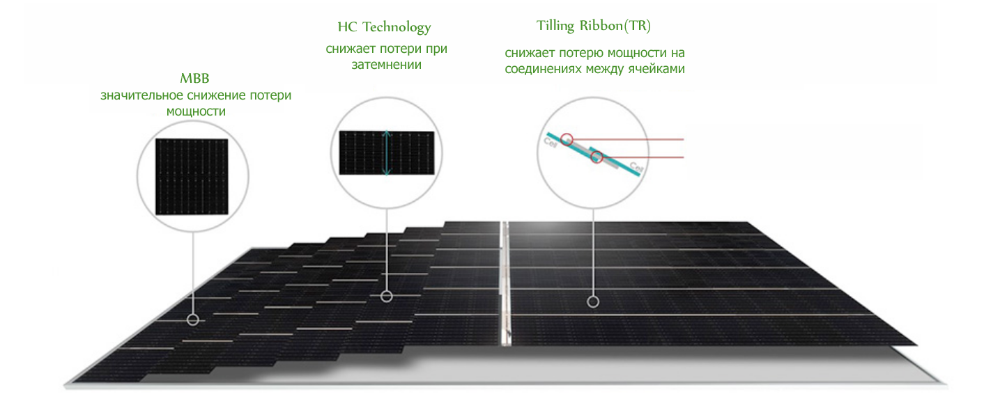 Half cell - технологія ділення осередку, значно знижує втрату потужності панелі при затемненні і деффектах тих, що виникають в процесі експлуатації